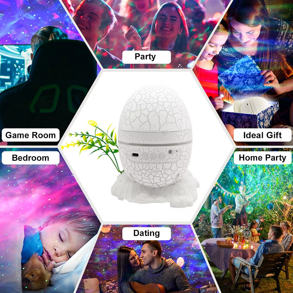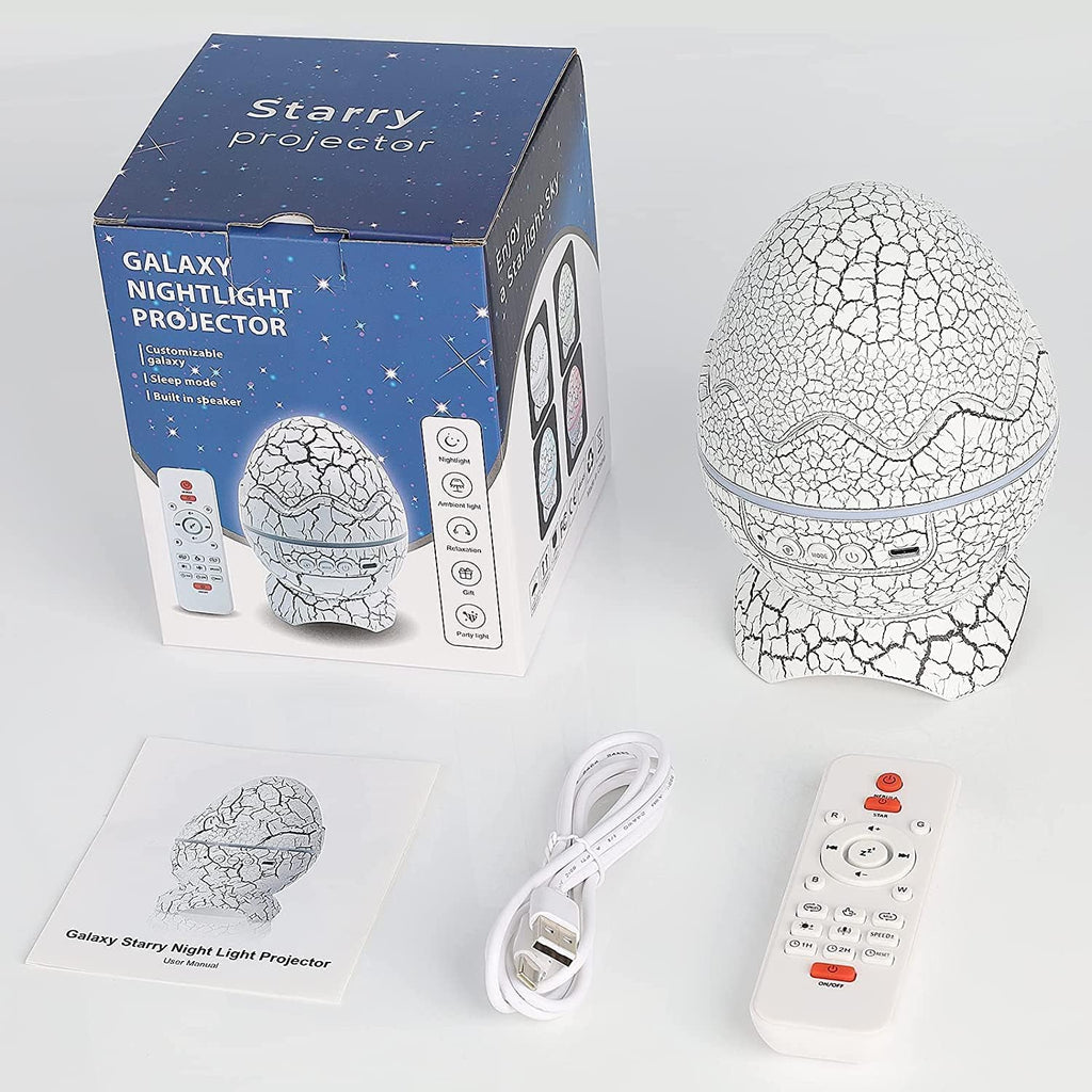 Transforma cualquier espacio en un ambiente de calma, fantasía y relajación. El Proyector Dino Huevo combina proyecciones de galaxias, sonidos ambientales y un parlante Bluetooth integrado para brindar una experiencia multisensorial completa.